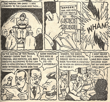 We also get Electroman’s origin (for some reason as the third story in the issue). Dan was originally a thief known as fingers Watkins. On a job, he is caught and sentenced to death by electric chair. However, not only was he not killed by the chair, it has cured him of his criminal tendencies and gave him superpowers: