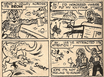 Next up in space thrills is the comedy strip, Captain Jetsom, a fantasy about space pirates. Here the crew try to battle a kind of space dragon which has been attacking the spaceways (in order to rob the ships themselves):
