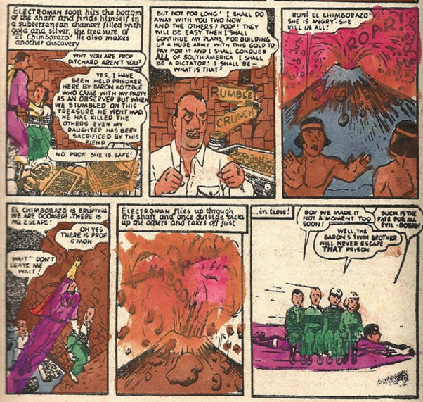 Going inside the temple he discovers Professor Pritchard, leader of the expedition, is tied up. The baron had found treasure in the city (it being his identical twin brother who is in prison) and then got the native inhabitants of the city to try to sacrifice the professors daughter. Suddenly a volcano erupts so Electroman flies all the expedition off leaving the baron (and presumably the inhabitants of the city) to their fate.