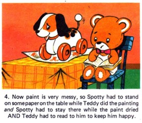 asks for his wheels to be repainted. Teddy agrees but whilst Spotty’s wheels are drying he has to do everything for him. When they are finally dry Teddy is exhausted and concludes he will go shopping alone in future.
