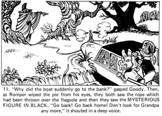 Romper Rabbit and the farmers are pleased when it turns out grandpa fox has disappeared and giant footsteps are all that remains. However, his grandson Goody Fox is upset and, so, Romper and Goody set out in a boat to find him. They are waylaid by a mysterious cloaked figure who tells them to stop searching.