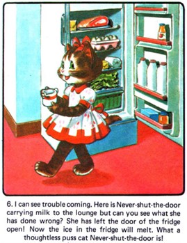 In this anthropomorphic feline story Num Num’s friend Never-shut the-door is invited round for dinner. Never-shut-the-door gets the milk out of the fridge but does not close so it defrosts.