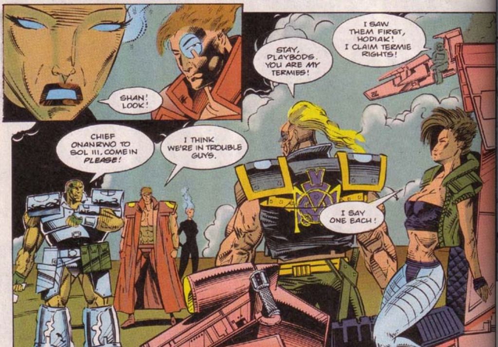 Next up we have Onan, Angel and Shan, who are down on a planet, seemingly caught in the middle of a fight between Termies (I presume this mean prisoners?) and their guards. After defeating the Termies they discover they were just androids. They cannot investigate further as they are captured and thrown in a prison cell.