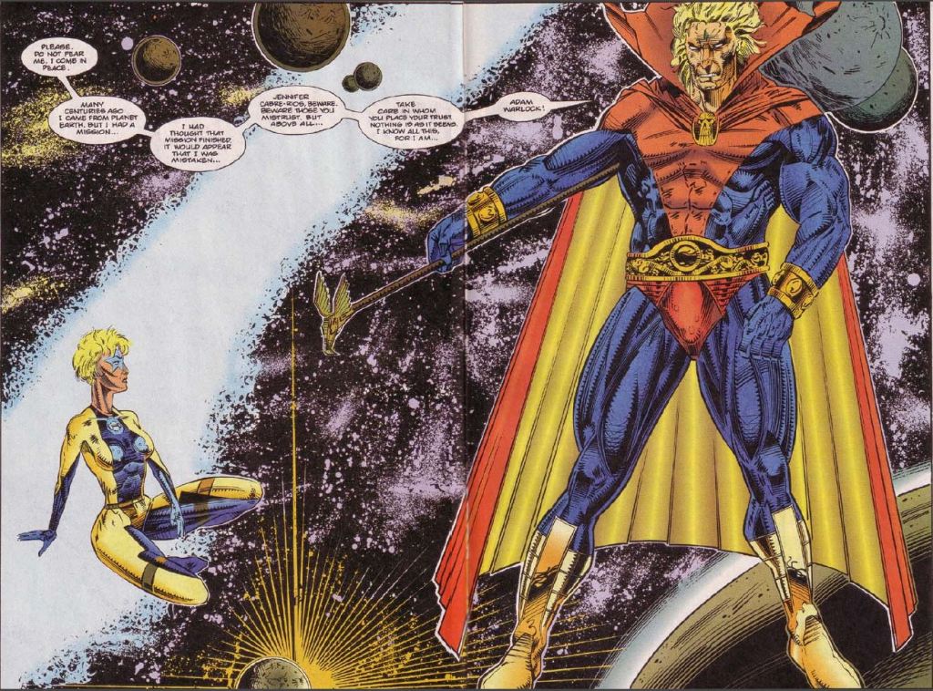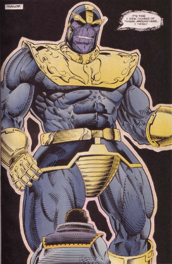 Thanos, of course! I mean who else would Adam Warlock want to turn up to warn about? Paste-Pot Pete?