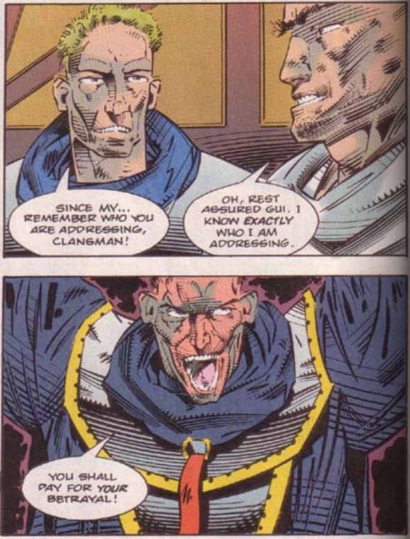 The final thread concerns the Clan Cyrose, some kind of cult who had apparently once been powerful but something happened to them following Galactus’ departure. Gui Askran blames other’s betrayal for this but the one they worship arrives, turns him to stone and takes over. Who could this possibly be?